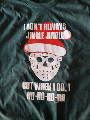 You're all too familiar with the classic eerie "ch ch ch ch" sound and exactly what that means. Share a holiday themed version of your love of horror films with our hockey mask fan tee, reading,